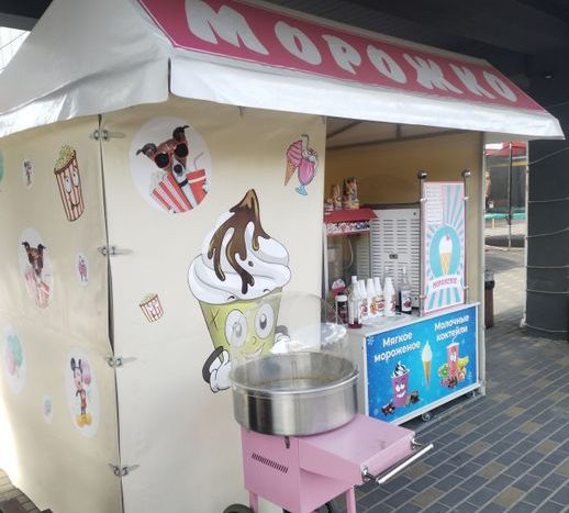 Палатка,столы, аппарат для приготовления мягкого мороженого(фризер Италия) аппараты для приготовления попкорна,сладкой ваты, молочных коктейлей,холодильник, рукомойник,эл.проводка.При выезде на праздники всё оборудование помещается в минивэн или прицеп. 5000y.e.Тип: Общественное питание