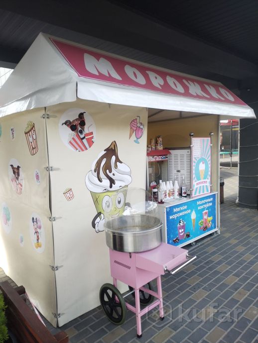 Палатка,столы, аппарат для приготовления мягкого мороженого(фризер Италия) аппараты для приготовления попкорна,сладкой ваты, молочных коктейлей,холодильник, рукомойник,эл.проводка.При выезде на праздники всё оборудование помещается в минивэн или прицеп. 5000y.e.Тип: Общественное питание