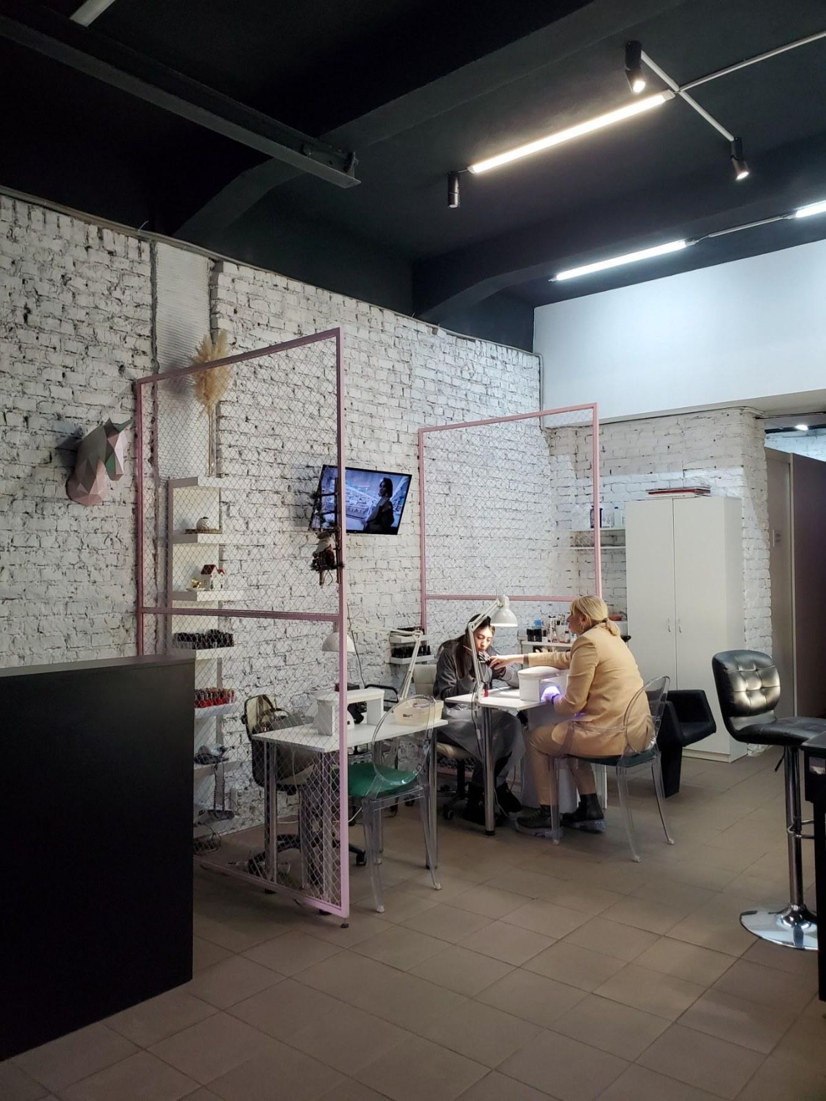 Пространство функционально разделено на зоны ресепшн, парикмахерские услуги (можно наращивать волосы и плести брейды), зоны маникюра и педикюра, комнаты для персонала и комната для хранения расходников/материалов студии.
